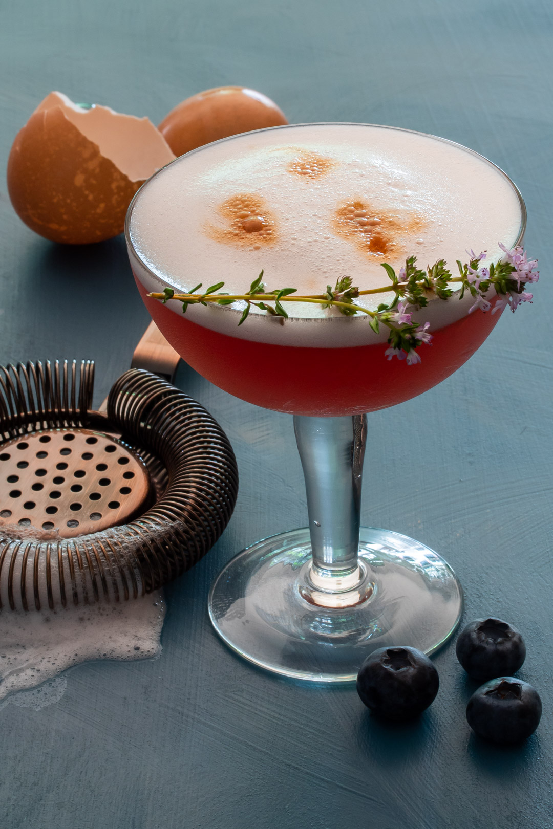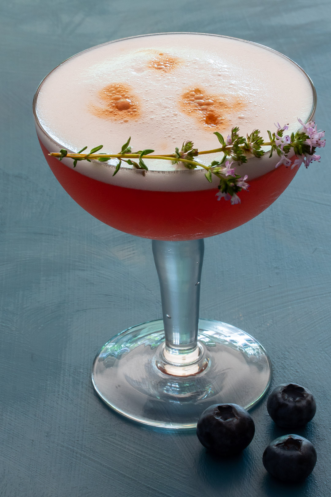 Styling – Fancy coupe, fresh thyme sprig & blueberries – The blueberry shrub pisco sour cocktail is a gorgeous light purple colour that matches the amazing light purple flowers on my thyme plant some of which I also added to the shrub for flavour. I have chosen to serve this drink in a vintage cut glass cocktail coupe that features a rose motif. The aroma of thyme conjures sunshine and warmth and the tiny delicate flowers are so beautiful and perfectly match the blueberry colour of the shrub syrup, so I have added a sprig of fresh thyme for a pop of added delicate green and purple colour and a lovely warm herbaceous aroma. I shot this cocktail with some fresh blueberries in the foreground and I recommend serving or garnishing with fresh blueberries as well. The blueberry shrub pisco sour cocktail is a celebration of Spring – new flowers and fruits – fresh in season blueberries and thyme.