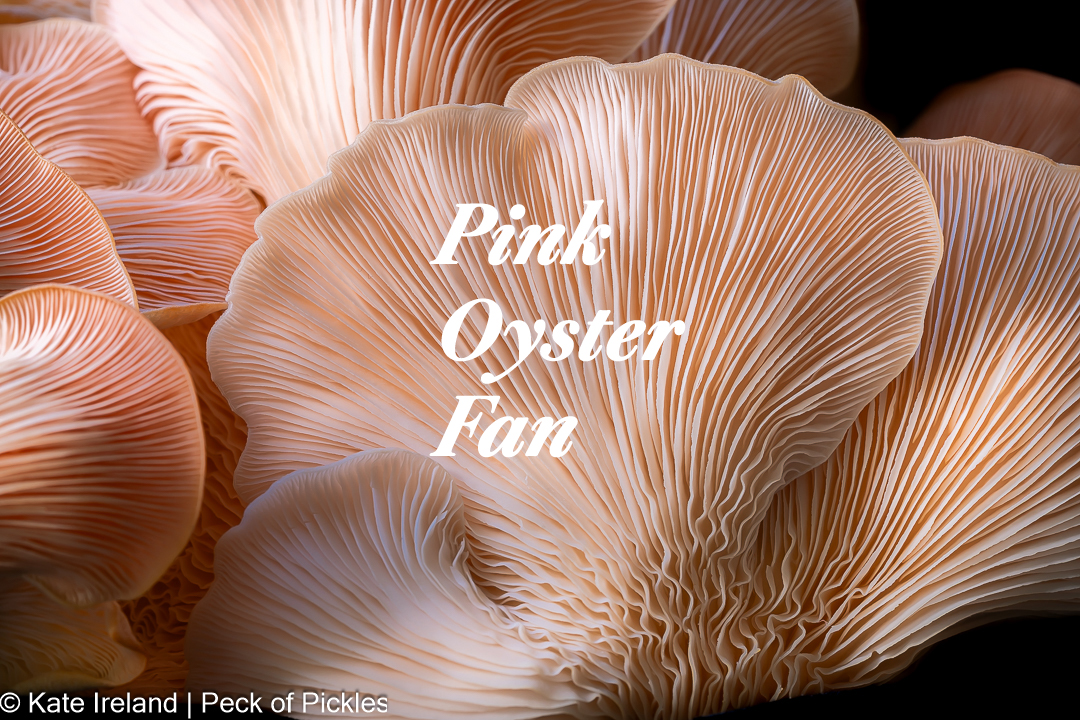 Pink Oyster Mushrooms Mini Collection, Pink Oyster Mushrooms on Chair, Full Fruiting, Fans, Fan Detail, 2025. Click here or on the Series Titles for licensing and to view.