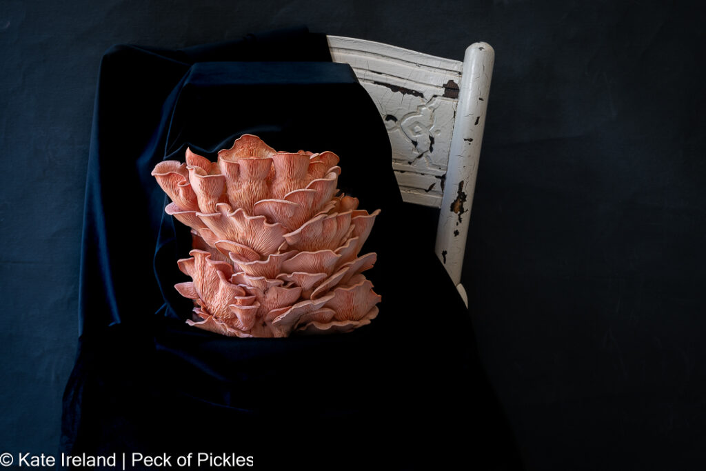 When I shoot mushrooms I start from eye level like a portrait with the mushrooms sitting on the chair against the backdrop, draped in velvet. From here I move in as close as I can from this angle to get a photo of the texture. Sometimes I like to photograph the texture as a flat lay as it is easier to get further away from the subject and have more of the texture in focus this way – I use the arm on my tripod for this, although I used a very old tripod for a long time that had no arm – the level was also broken so I used my phone level to check the angle. Then I start observing the texture and the light and see what I find interesting – this time I could see the intricate coral like forms when looking down on the mushrooms – this is a new angle for the Pink Oysters, and I think quite interesting because there are textures and smooth surfaces and different gradients in the depth of colour.